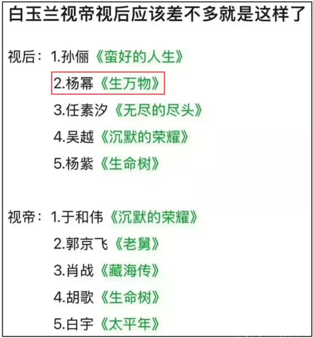 最近几年,85花集体谋求转型,急需主流奖项的认可。对于杨幂来说,《生万物》是她近几年的作品中热度最高且质量较好的,今年的颁奖季也是她离主流奖项最近的一次,一旦错过,那么下一次再如此靠近奖项就不知道是何年何月了。