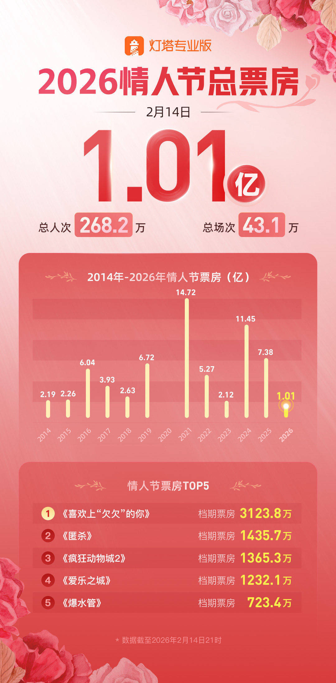 据灯塔专业版,截至21时,2026年情人节档票房1.01亿,《喜欢上“欠欠”的你》获得2026年情人节档票房冠军!